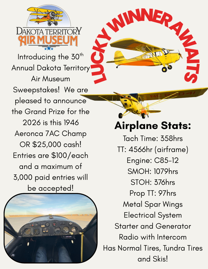 The Grand Prize Sweepstakes drawing will be held Saturday, August 15, 2026, at 4pm CST, at the Dakota Territory Air Museum, 100 – 34th Ave NE, Minot, ND. You need not be present to win. Winners will be selected by random drawing from all entries. See Sweepstakes Rules on our website.